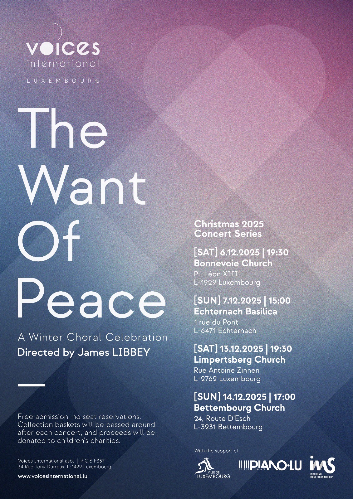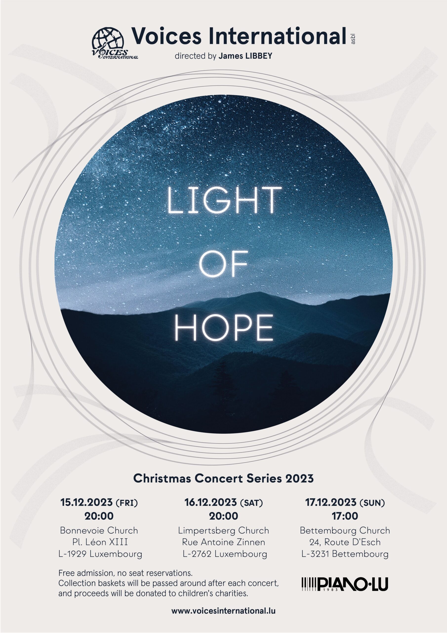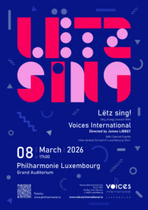 Voices International is a multinational SATB choir in Luxembourg founded in 1997. As a non-profit organization, we hold concerts where we perform songs from a wide variety of musical styles in different languages with all proceeds from our concerts going to childrens’ charities.