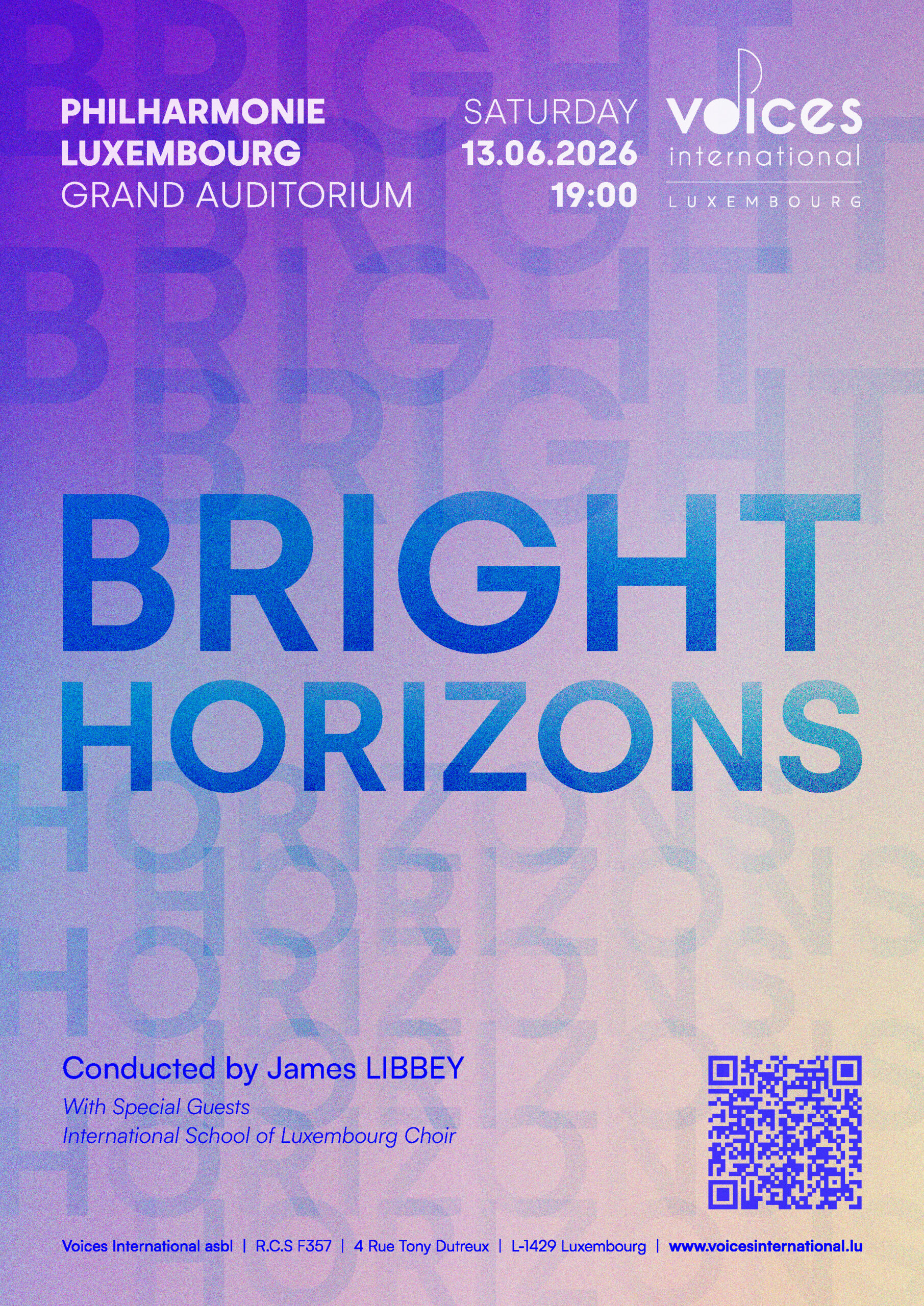 Our next concert will be the culmination of our Spring 2026 season. Join us at Philharmonie Luxembourg on the 13th June, 19:00 for 2 hours of pure joy and harmony with more than 200 singers on stage, accompanied by our talented musicians.